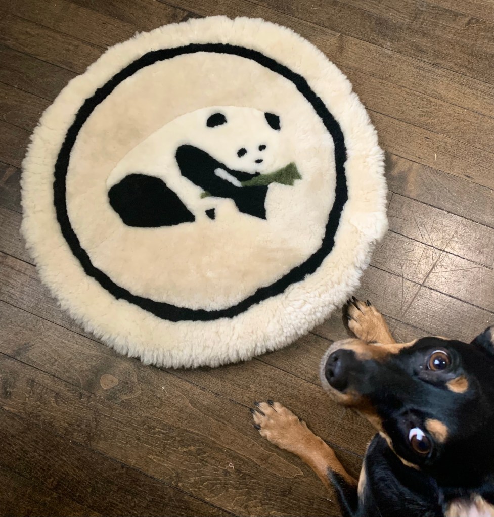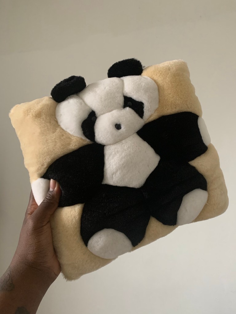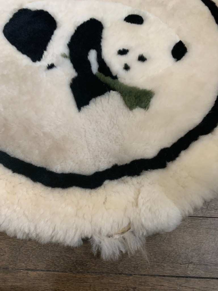 While looking for placemats and blankets at a thrift store in Chicago, in the corner of my eye I see a fuzzy ivory circle on the floor across the room. Upon closer inspection, I see that it’s this adorable fleece panda mat.