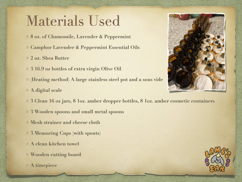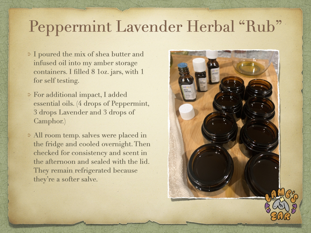 Potions I have featured are herbal infused salves (also considered balms) and herbal oil infusions.