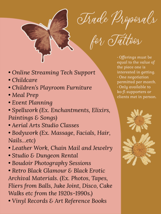 ☁︎ Minimum for all local custom tattoo services are $300, for traveling custom tattoo services it is $500. $150 is the minimum for predrawn flash designs found in studio or instagram. Ko-fi members receive a discount perk on predrawn designs only.